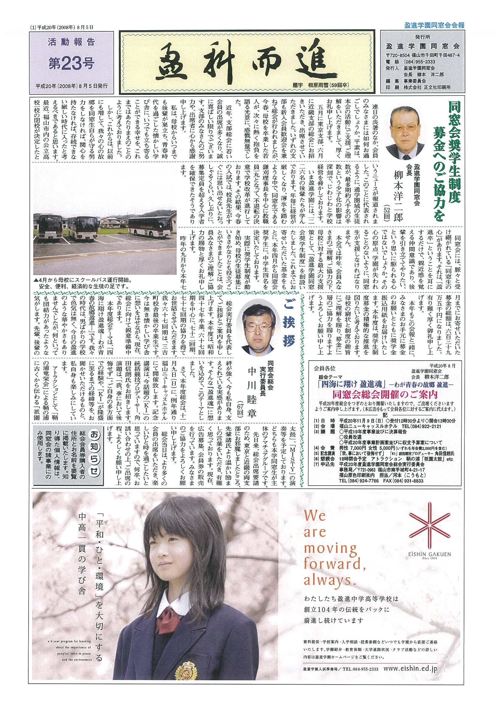 ・鎌刈理事長挨拶、立石学校長近況報告